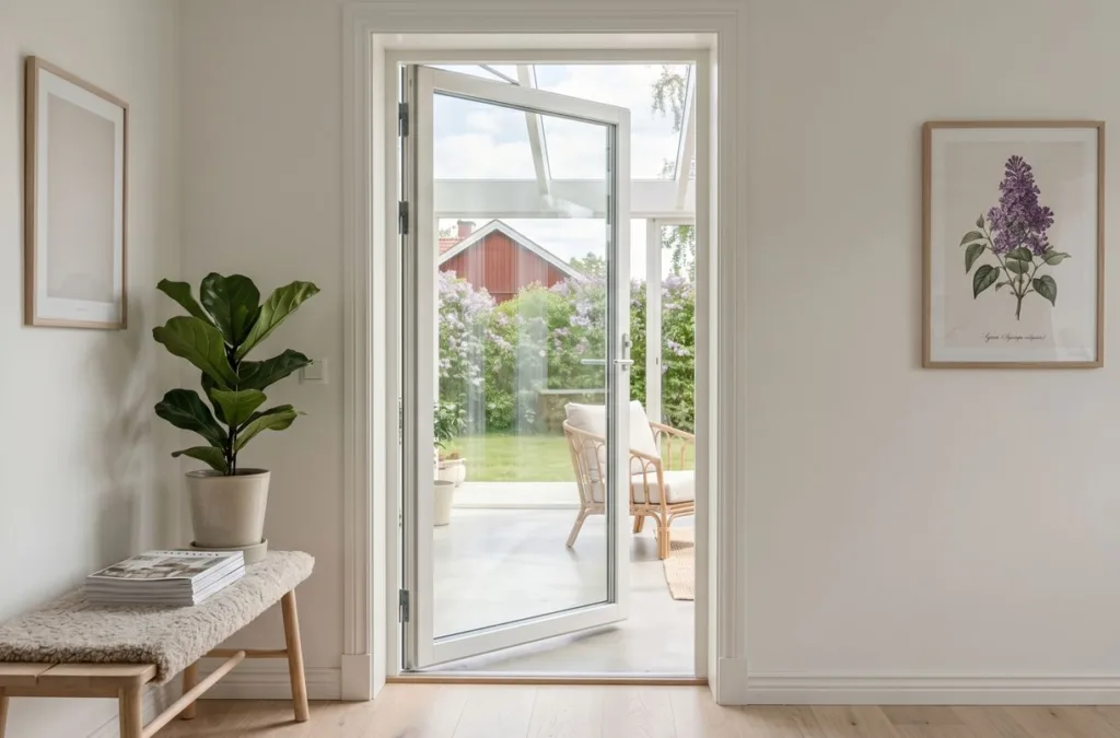 Med en hel isolerglaskassett på 26 mm, försedd med energibeläggning och fylld med argongas, skapas en gräns mellan inomhus och utomhus. Den låter dig uppleva en omslutande utomhuskänsla samtidigt som den ger dig en obruten utsikt över trädgården och naturen utanför.