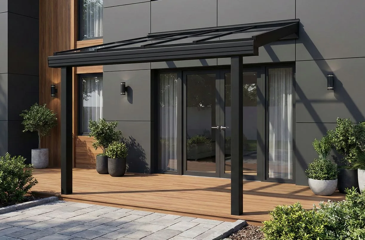 Måttanpassat skärmtak i aluminium med glastak